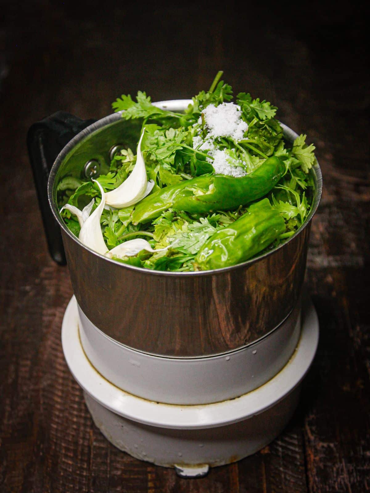 - For the green chutney, blend everything together in a blender. Adjust salt and lemon juice if required.