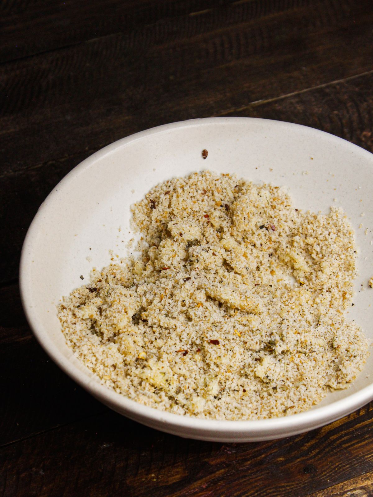 - In another bowl, add the breadcrumbs, garlic powder, salt, black pepper powder, mixed herbs, and cheese. Mix them together.