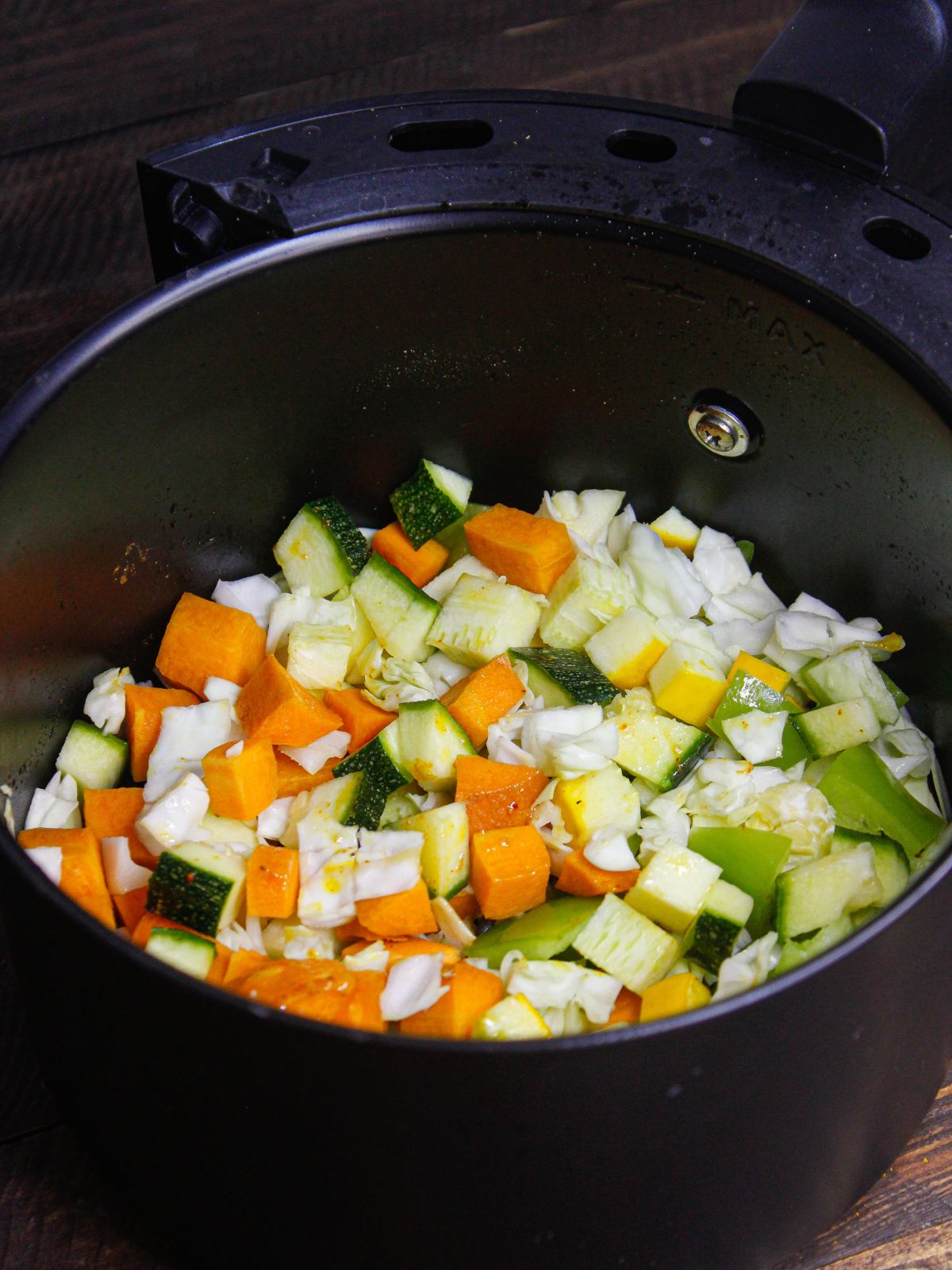 - Ensure that all the veggies are cut into roughly the same size before you pop them in the air fryer. This will get them cooked all the way through.