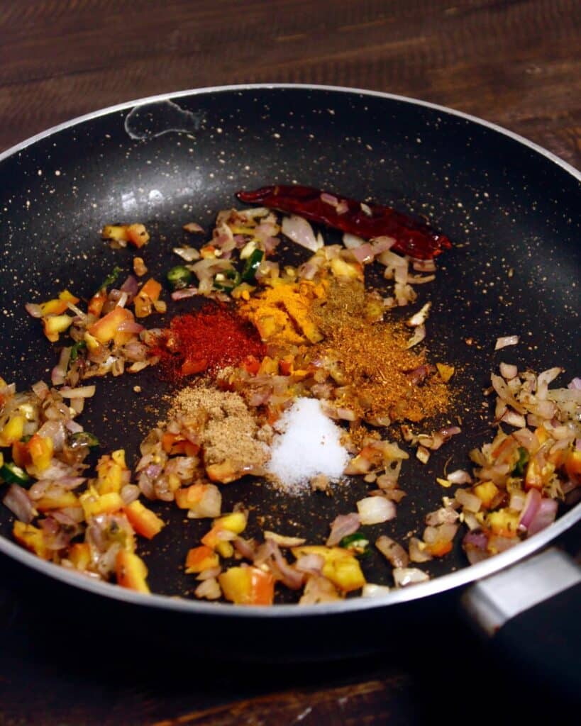 - Add in all the powdered spices next along with salt and saute.