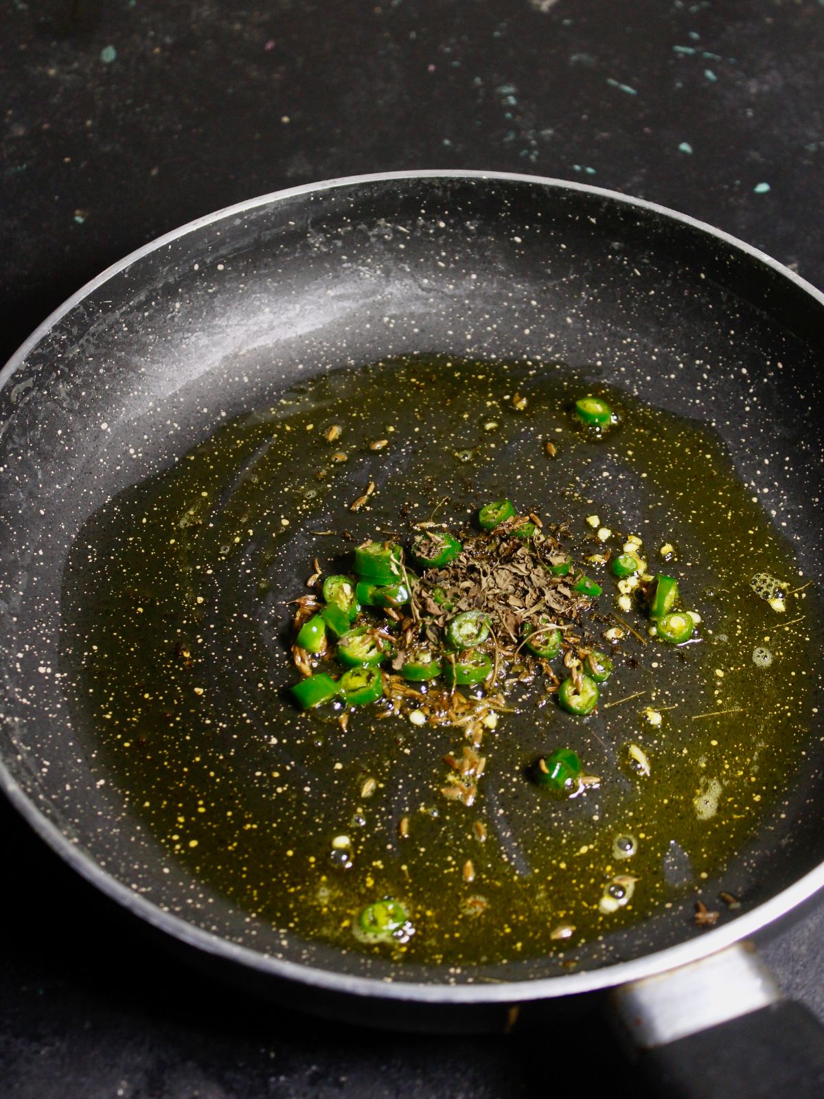 - Heat oil in a pan. Add the cumin seeds and green chilies.