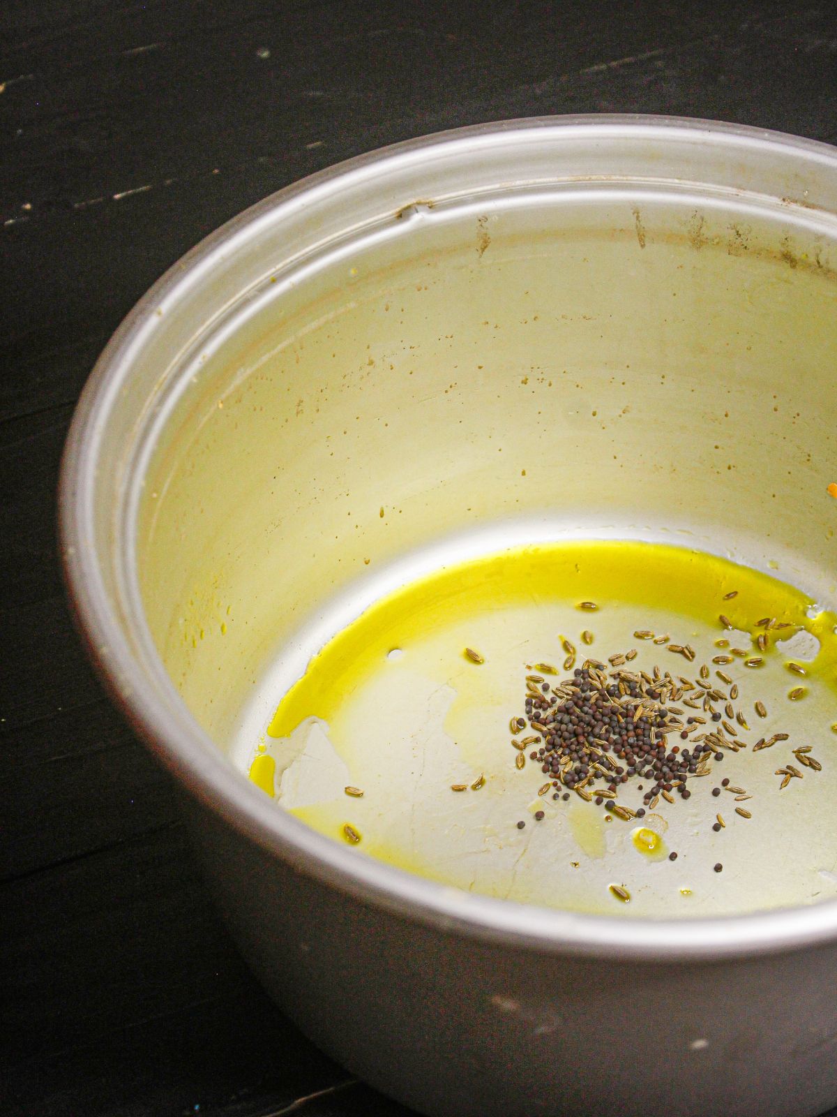 Once the oil starts to heat up, add in the cumin seeds and mustard seeds.