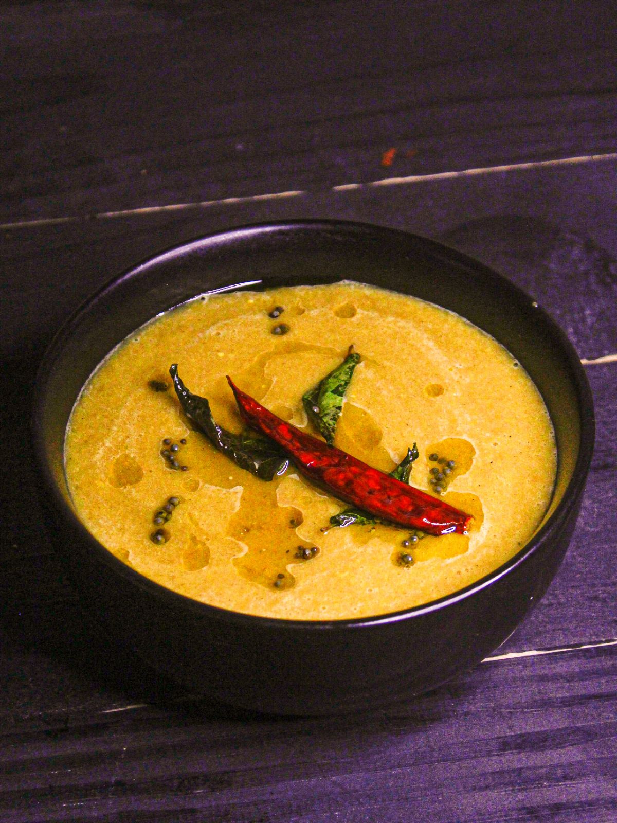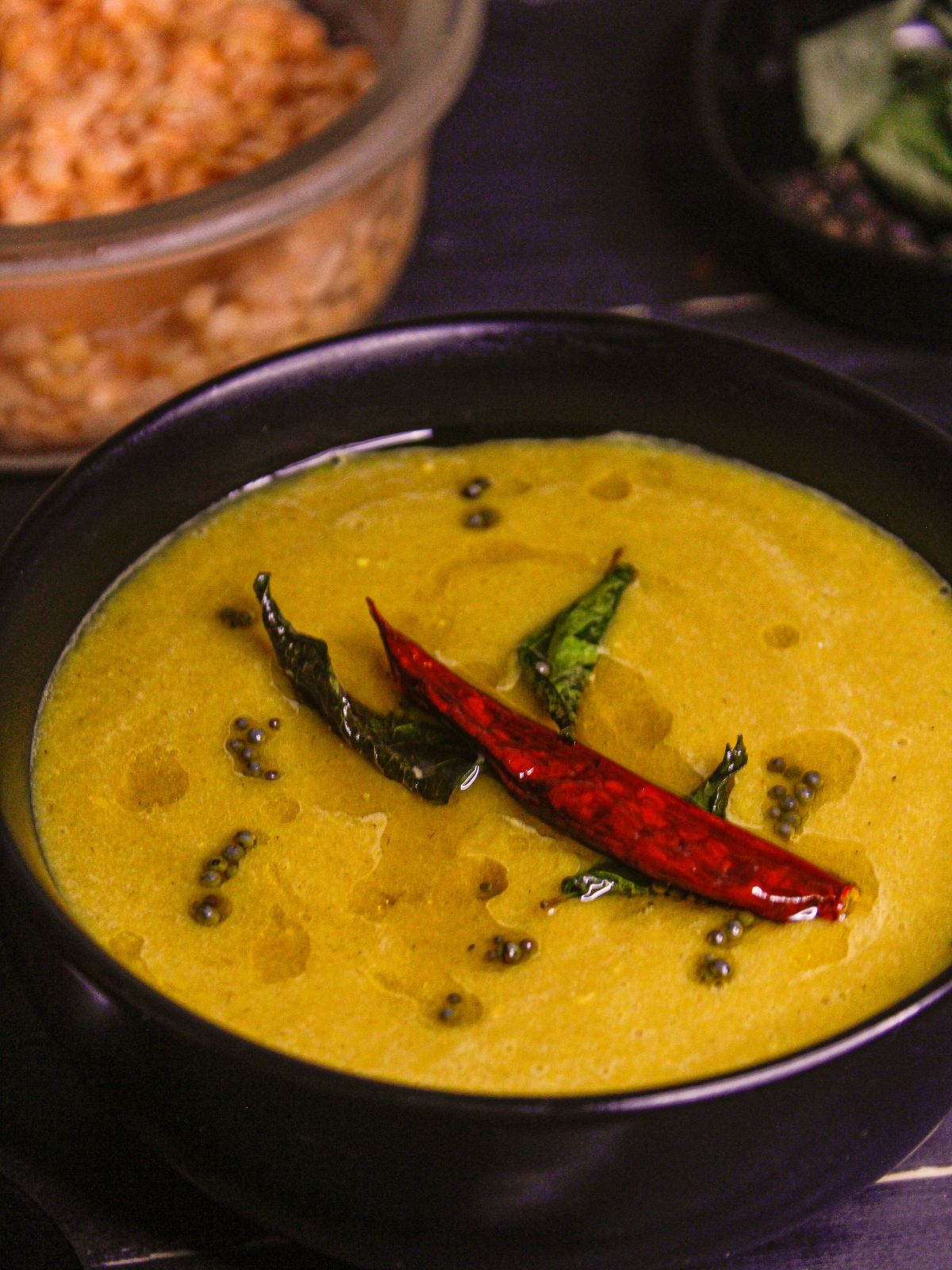 - For the tempering, heat oil in a pan. Add the mustard seeds and the curry leaves and let them sputter.