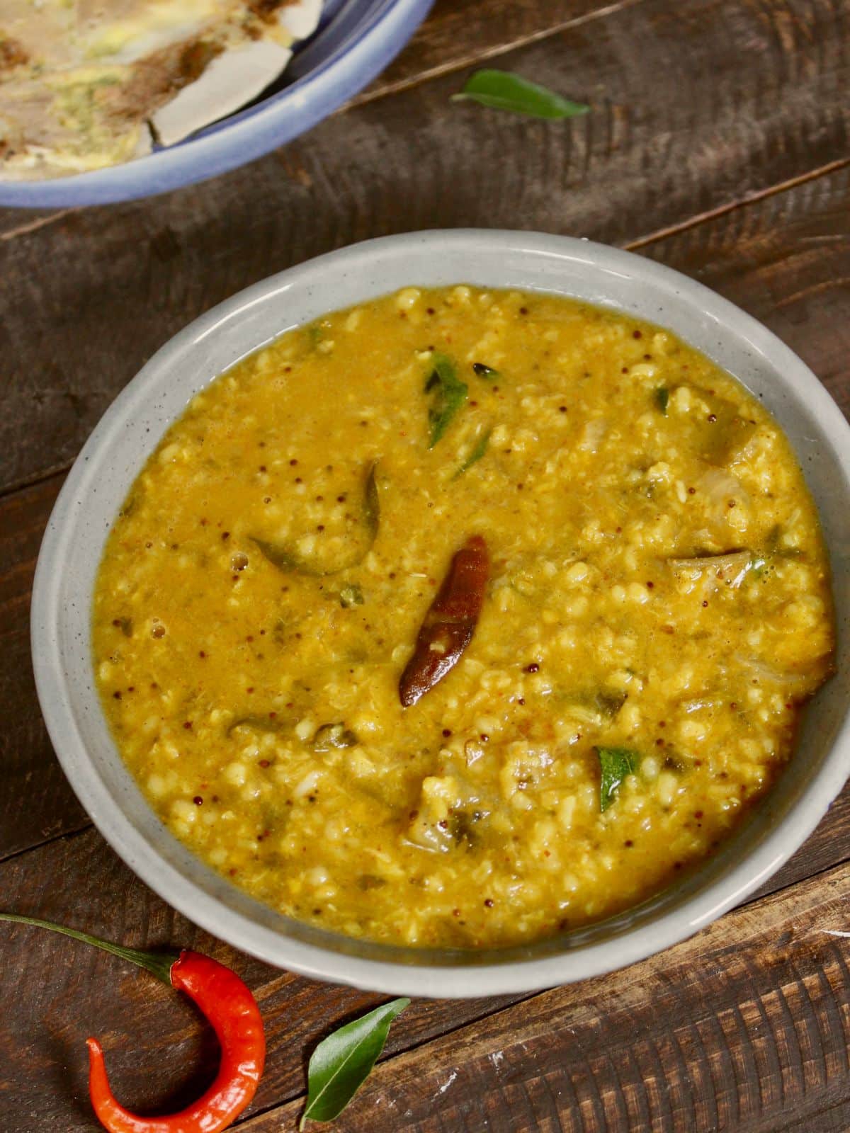If you love sambar- the famous Indian lentil soup, you’ve got to give this mango sambar recipe a try. This sambar has a unique, tangy flavor from raw mango, and is super savory, delicious and incredibly versatile.