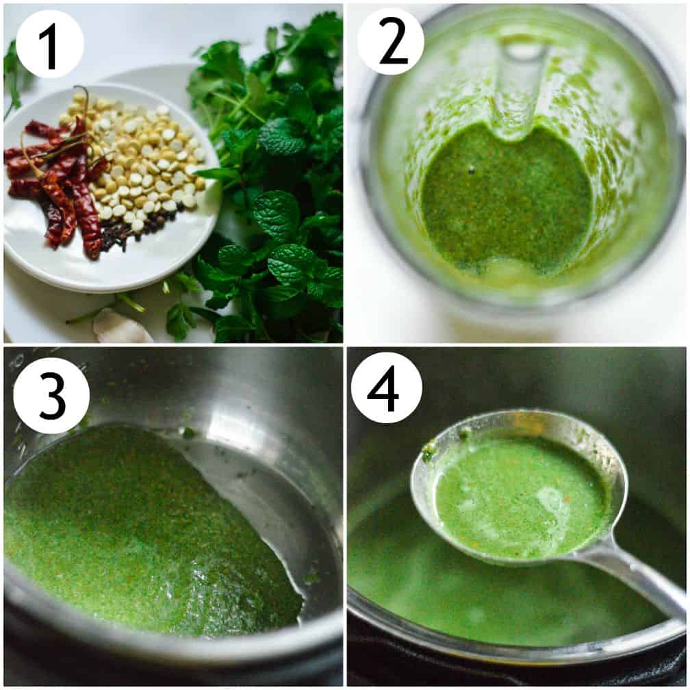 Cilantro, mint, and green chilies are used with roasted dalia/channa daal, ginger, garlic, cooked peas and whole spices to make the spice paste. The paste is then cooked in little oil and thinned out to make a spicy gravy used as the base in the masala puri chaat.