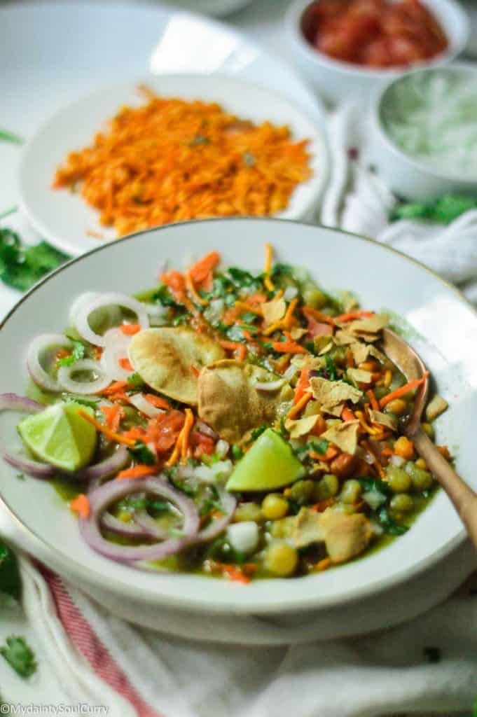 The masala gravy is usually cooked separately and added to the boiled peas right before making the chaat. Some of the favorite toppings of this chaat are: grated carrots, chopped onions and tomatoes, and crispy sev/mixtures. The puris are crushed and used in this chaat unlike other street food chaats like pani puri and dahi puri.