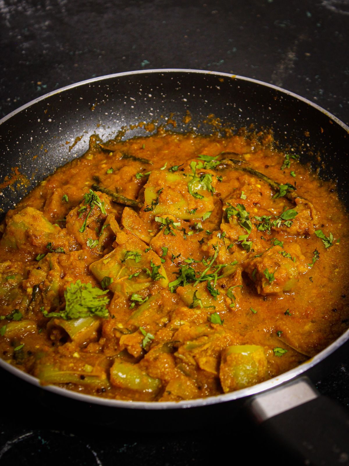 - If you don’t have the time to stuff the chilies and then use them for the recipe, you could just use the large chillies as is for the recipe- just stir fry them in a pan for a few minutes until they soften, and then follow the rest of the process as is.
