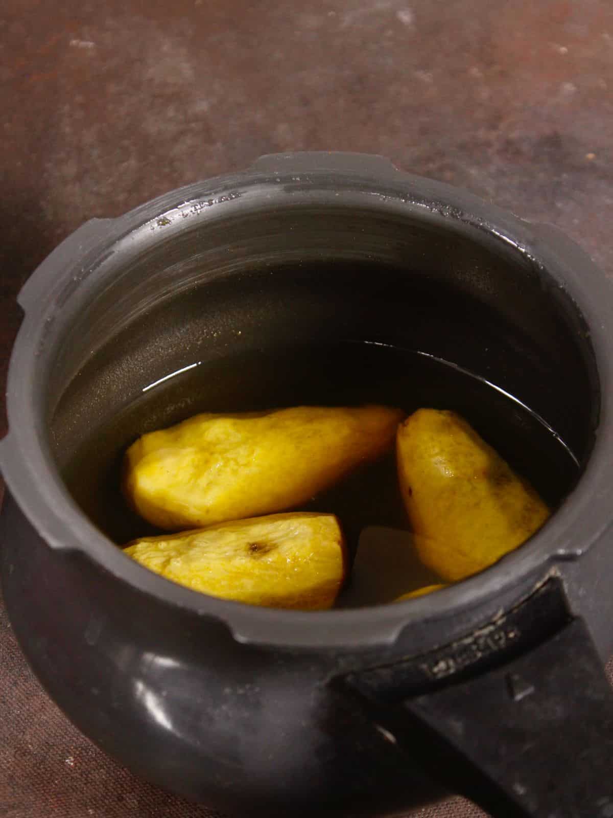 - In a pressure cooker, add the peeled and cleaned yams along with the pinch of turmeric powder and water and mix. Pressure cook for about 3-4 whistles. This might change depending on the type of pressure cooker you have.