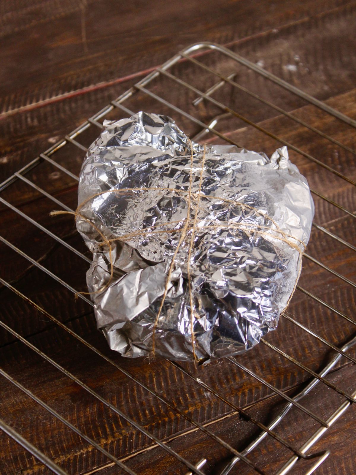 - Next, fold the aluminum foil and pack the chicken using a thin thread.