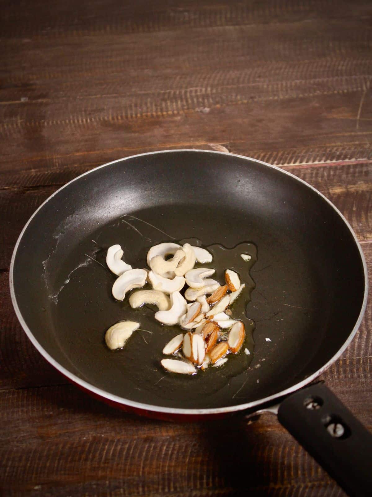 - For the dry fruits, heat ghee in a small pan. Add the dry fruits and saute. Make sure the dry fruits are properly roasted in ghee.