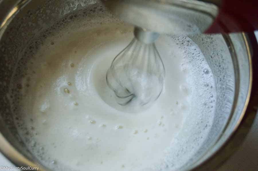 Use your electric mixer or stand mixer to whip the chickpea can water for making your aquafaba. Beat for almost ten minutes to get the stiff peaks. The water will first be foamy, then white and eventually it will start to turn soft, airy and stiffer. Once you start to see the peaks, stop it right there.
