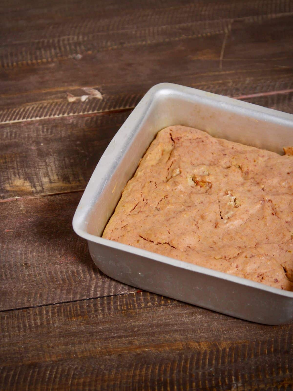 - Brush the sides of a baking pan and pour in the cake mixture.