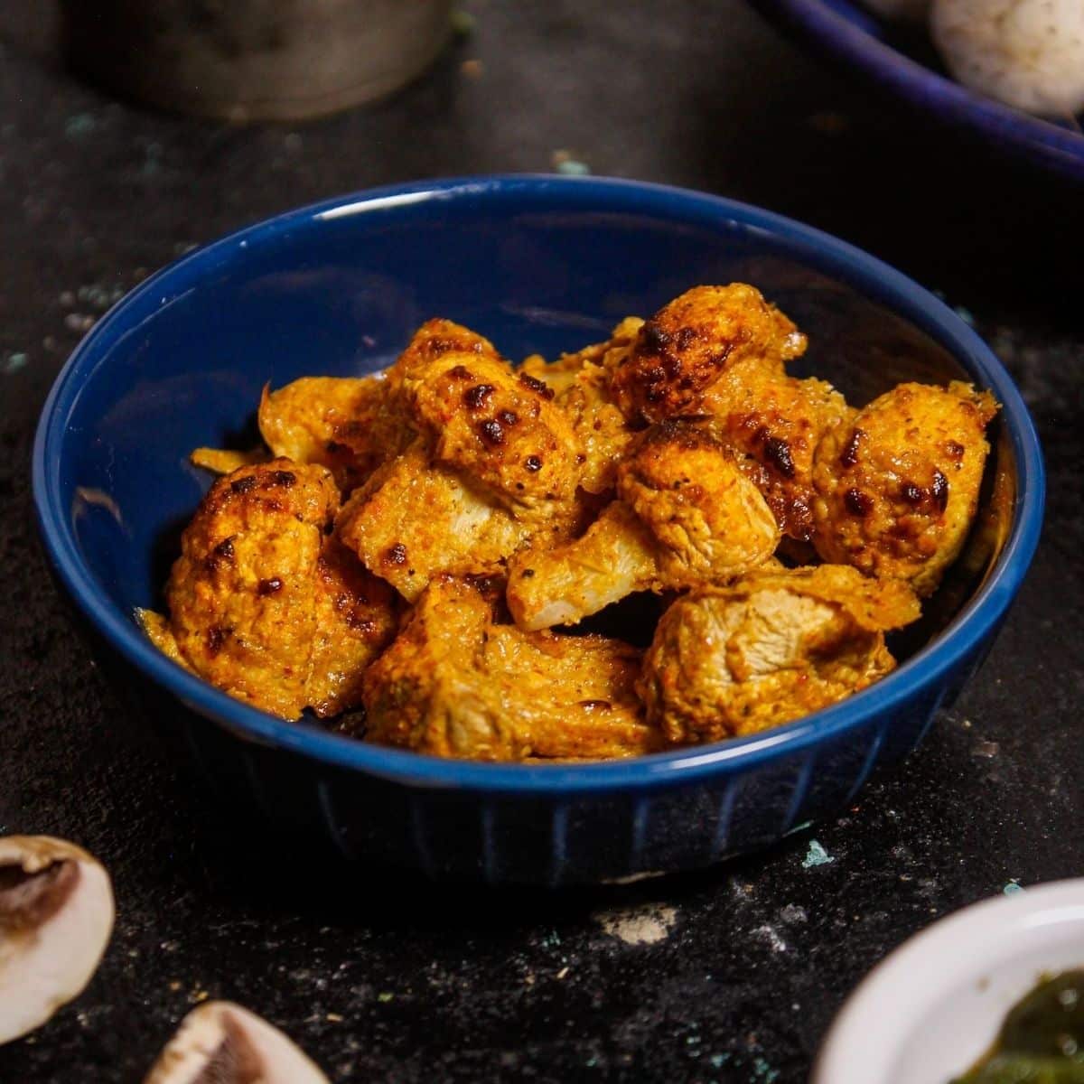 Add in the halved mushrooms next and coat them well with the curd mixture.