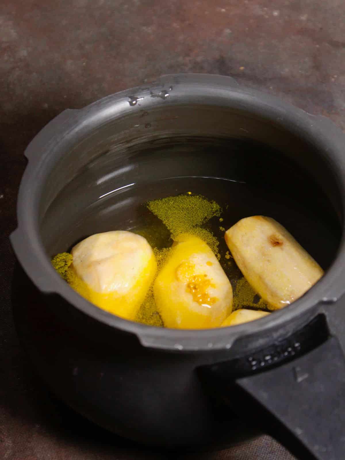 - In a pressure cooker, add the peeled and cleaned yams along with the pinch of turmeric powder and water and mix. Pressure cook for about 3-4 whistles. This might change depending on the type of pressure cooker you have.